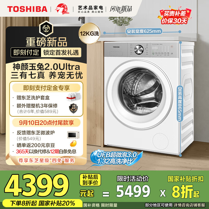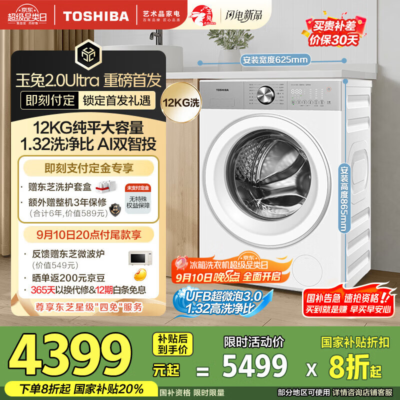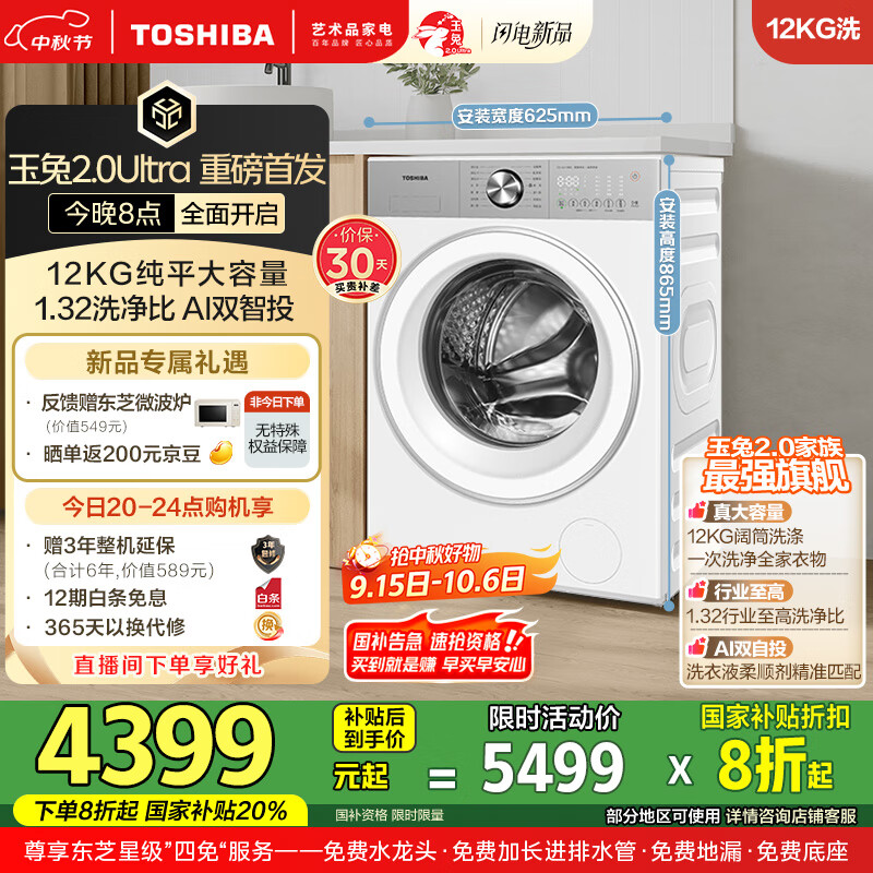 东芝(TOSHIBA)滚筒洗衣机全自动家用【玉兔2.0Ultra DG-12T18BW】纯平全嵌12公斤大容量 洗净比1.32 智能双投放