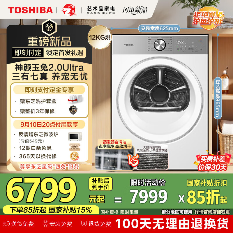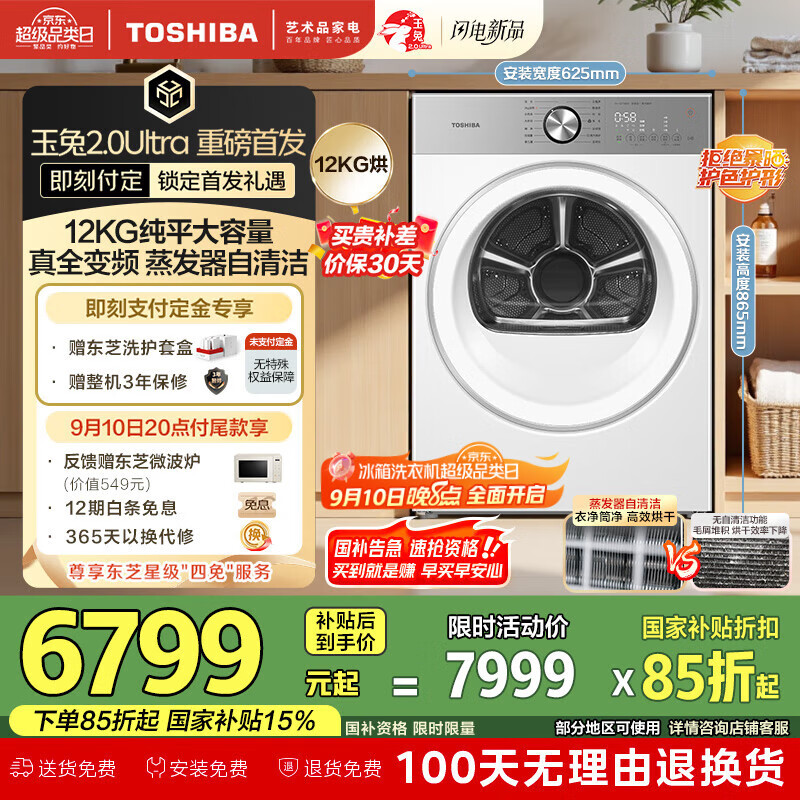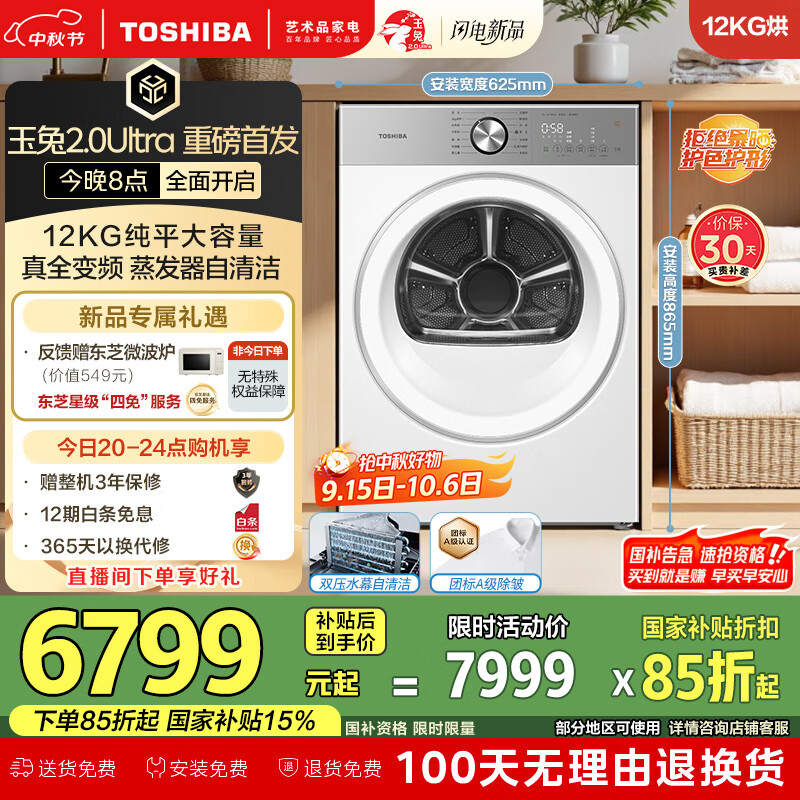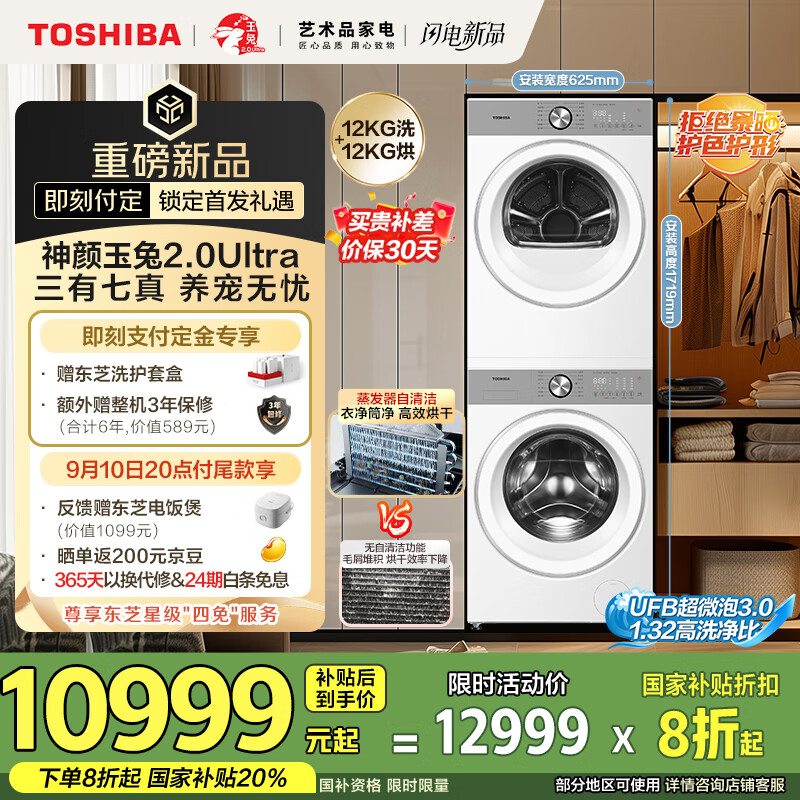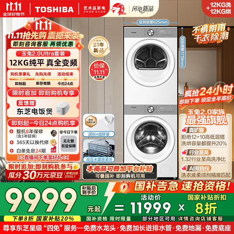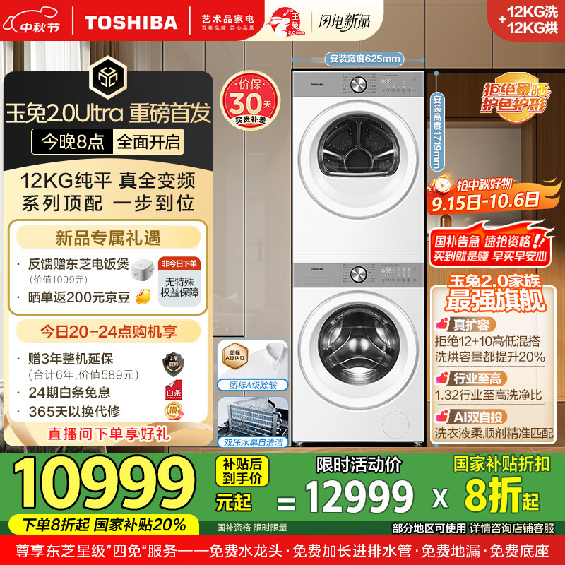 东芝(TOSHIBA)玉兔2.0Ultra洗烘套装 DG-12T18BW+T18BW 12KG大容量滚筒全自动洗衣机+变频热泵烘干机 洗净比1.32