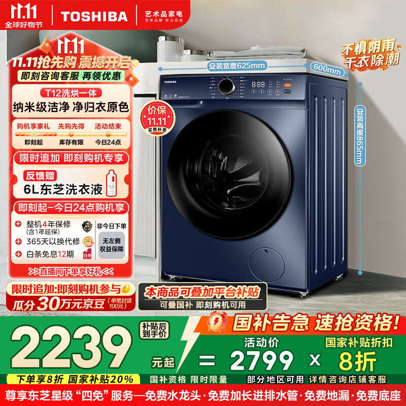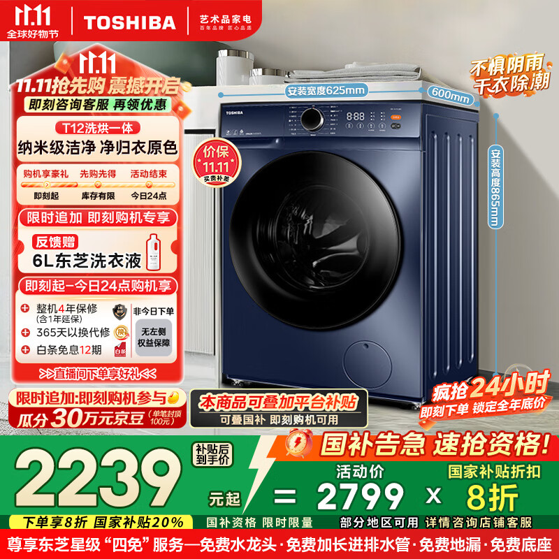 东芝(TOSHIBA)滚筒洗衣机全自动家用DGH-127X17BW 带烘干洗烘一体 纯平全嵌 1.28洗净比 12公斤 家电国家补贴20%