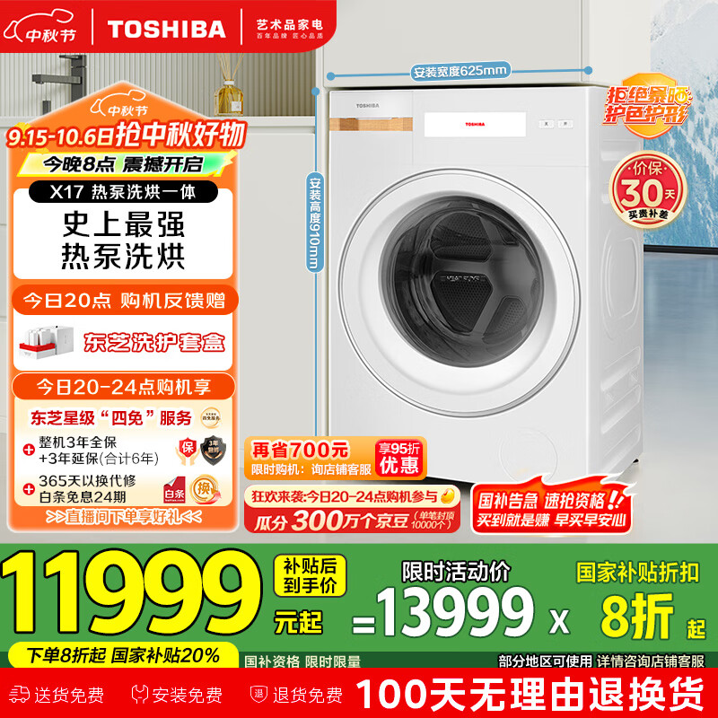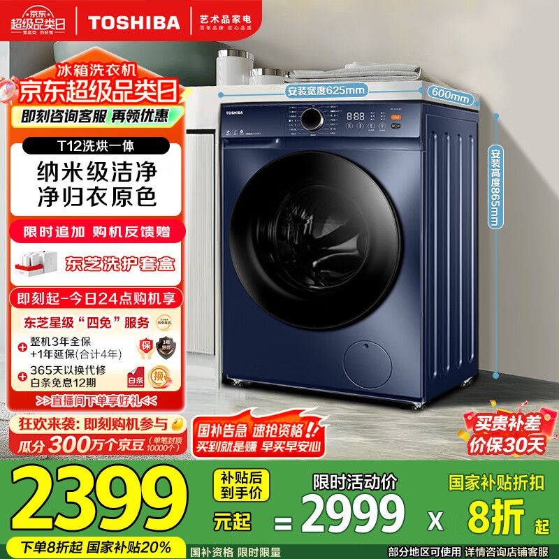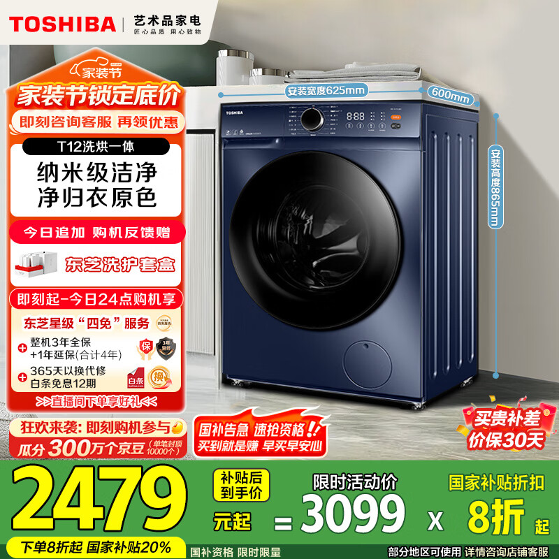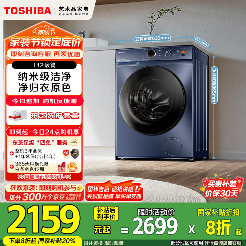 东芝(TOSHIBA)滚筒洗衣机全自动家用DGH-127X17BW 洗烘一体洗衣机 纯平全嵌 1.28洗净比 12公斤 家电国家补贴20%